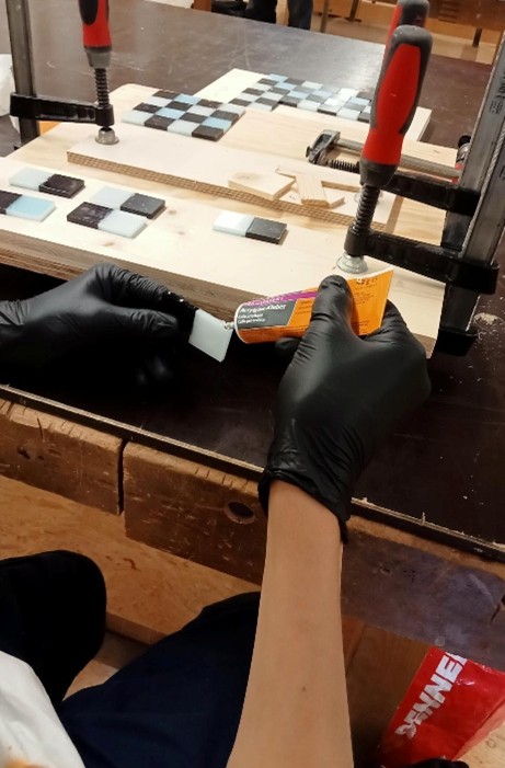 Ich habe ein Schachbrett aus Acrylglas mit LED-Beleuchtung in den Tisch eingebaut, den ich im Werken gemacht habe. Zuerst habe ich das Material besorgt und ein paar Probestücke für den Testschnitt zuschneiden lassen. Dann habe ich die kleinen Felder zusammengeleimt. Als Erleichterung habe ich eine Leimform gebaut. Zum Schluss habe ich das Brett mit den LEDs unter dem Tisch befestigt – für eine einzigartige Beleuchtung. Ich musste auch das Kabel verdeckt durch den Tisch bis zur Steckdose führen. Es war eine schwierige Arbeit, aber sie hat sich gelohnt.