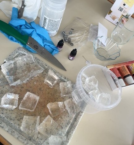 Ich wollte schon immer eigene Kerzen machen. Zuerst sammelte ich Infos, und danach entschied ich mich für Paraffin. Nachher bestellte ich Material: Wachs, Düfte, Farben, Formen. Ich testete verschiedene Arten, die eher einfacher und mit Wachswürfeln waren. Wachs wird als Erstes geschmolzen, mit Duft/Farbe gemischt und ins Glas gegossen. Mein Ziel war es, zehn bis zwölf Kerzen herzustellen. Ich werde sie ans Altersheim und die HPS Heerbrugg verschenken. Mein Titelbild entstand mit zwei Kerzen auf schwarzem Tuch.