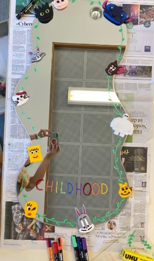 Meine Projektarbeit ist ein Spiegelrahmen mit Fimo-Figuren aus Kinderserien, die ich als Kind gesehen habe. Ich habe viele verschiedene Figuren genommen und zu jeder Figur einen QR-Code von einem kleinen Ausschnitt aus der Serie oder dem Film gemacht. Mit den QR-Codes können diejenigen, die die Figur nicht kennen, einen Ausschnitt aus der Serie oder dem Film anschauen. Die Figuren habe ich auf den Rahmen geklebt und die einzelnen Figuren aufeinander abgestimmt. Damit der Spiegel nicht so leer aussieht, habe ich die Figuren noch mit kleinen gezeichneten Lianen verbunden. Zum Schluss habe ich LEDs hinter dem Spiegel angeklebt.